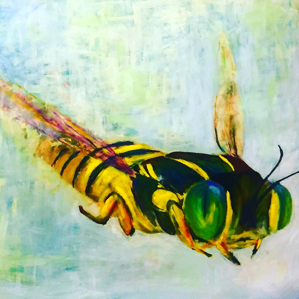 If I told you the title of a particular piece was “hypomanic” to refer to the state of mild mania associated with type II bipolar disorder, it might make you think about what the word means. It might also make you think I intend the piece to be a rather bleak self-revelation. But the title to the work, shown below, is Super Bee (hypomanic) – in my mind, it relates the superficial subject (the insect) to the emotion, gives you a better idea of what a hypomanic state might feel like. Many people, myself included, often experience this as a period of feeling super human – productive, positive, and creative without quite pushing into a hypermanic state which is generally more disruptive and distracting experience. The title also comes with a bit of humor – I don’t want you to pity me for living with mental illness: I want you to experience it just for a moment to understand me and my world a little better.